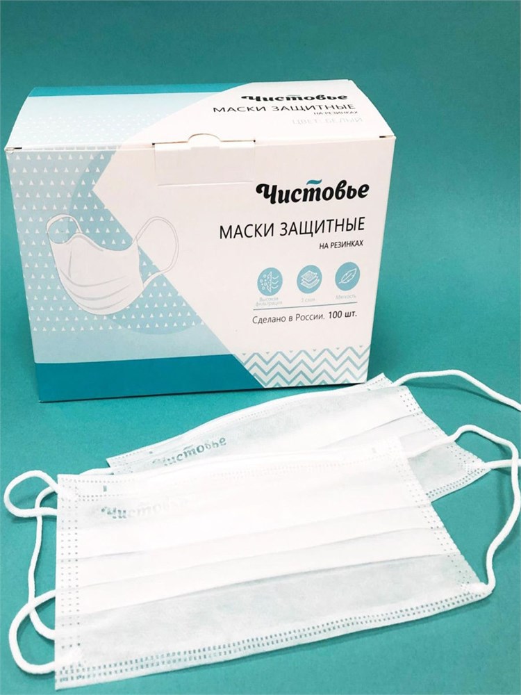 Одноразовая маска на резинке производства компании "Чистовье". Трехслойный материал обеспечивает максимальный уровень фильтрации. Первый и третий слои масок изготовлены из спанбонда, средний (фильтр) из мельтблауна. Маски не препятствуют свободному дыханию. Упакованы в картонную коробку.