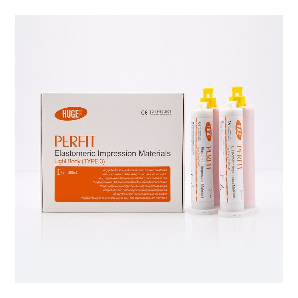 PERFIT – это силиконовый материал аддитивного отверждения, состоящий из поливинилсилоксана, наполнителя, пигмента, кросс-линкера, платинового катализатора. Хорошая текучесть, пластичность, очень низкий коэффициент усадки, легко извлекается из ротовой полости после оттиска, обладает хорошей химостойкостью. Оттиски, выполненные из этого продукта обладают высокой точностью, хорошим эластичным восстановлением, имеют достаточную прочность на разрыв и высокую стабильность размеров; могут обеспечить точную и надежную основную форму для клинического применения в стоматологических отделениях. Совместимость почти со всеми формовочными материалами. Материал можно надежно дезинфицировать.