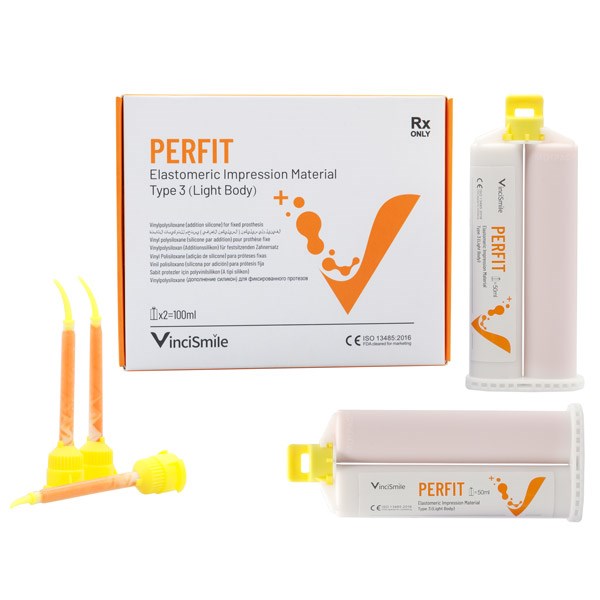 PERFIT – это силиконовый материал аддитивного отверждения, состоящий из поливинилсилоксана, наполнителя, пигмента, кросс-линкера, платинового катализатора. Хорошая текучесть, пластичность, очень низкий коэффициент усадки, легко извлекается из ротовой полости после оттиска, обладает хорошей химостойкостью. Оттиски, выполненные из этого продукта обладают высокой точностью, хорошим эластичным восстановлением, имеют достаточную прочность на разрыв и высокую стабильность размеров; могут обеспечить точную и надежную основную форму для клинического применения в стоматологических отделениях. Совместимость почти со всеми формовочными материалами. Материал можно надежно дезинфицировать.